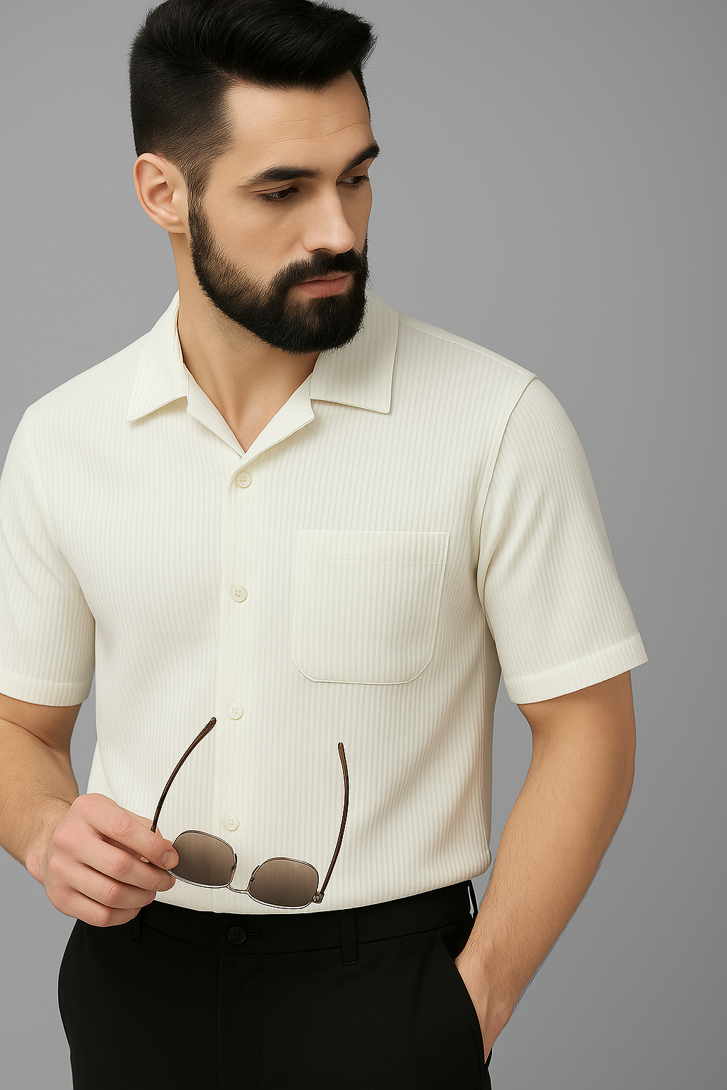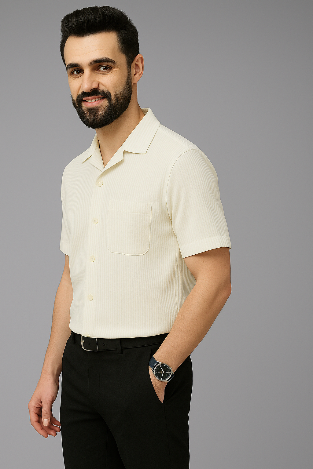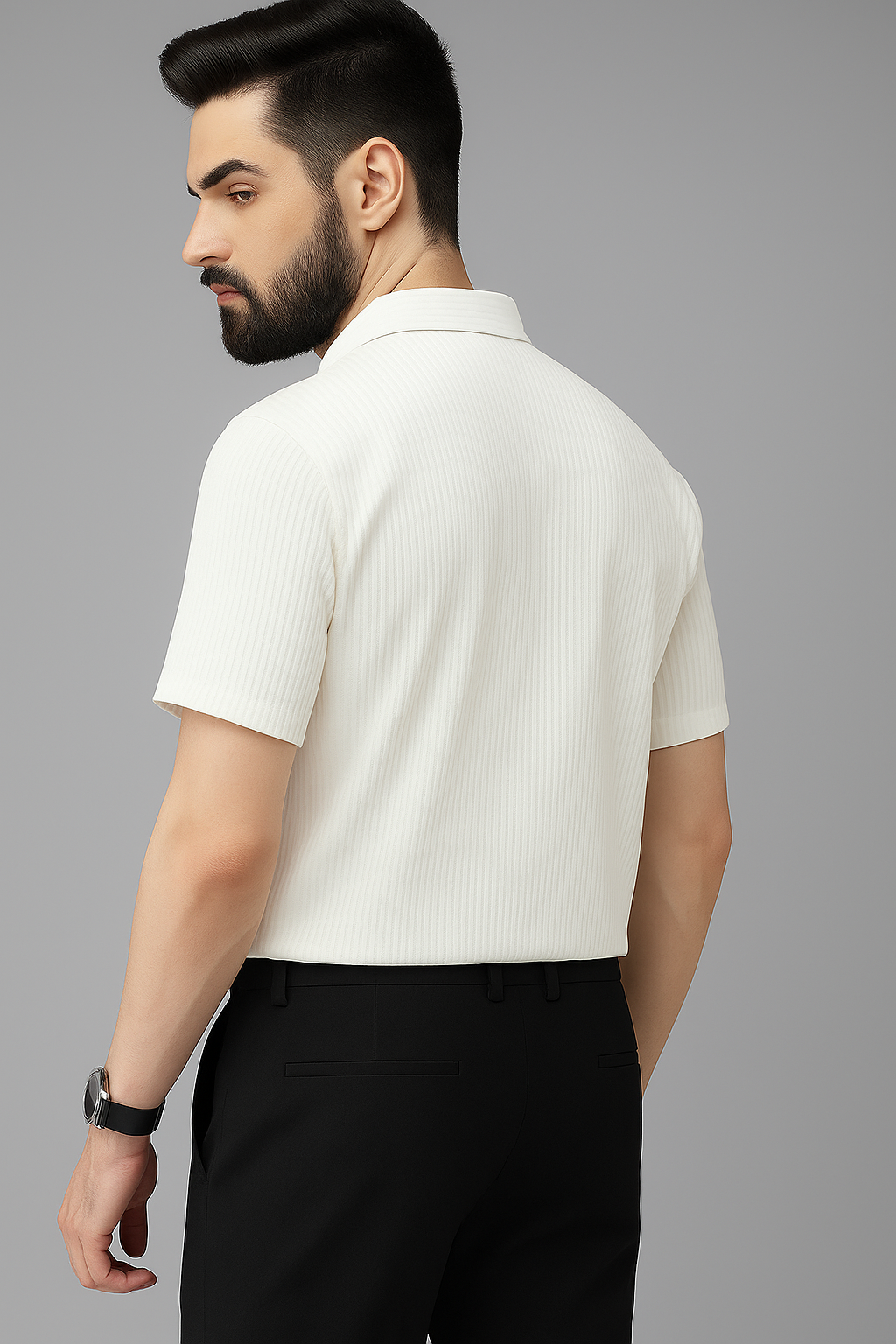 The Ivory Ribbed Shirt & Black Trouser Combo strikes the perfect balance between relaxed sophistication and structured style. Whether it’s a smart-casual event, an evening out, or an office day, this combo set delivers confidence and class every time.