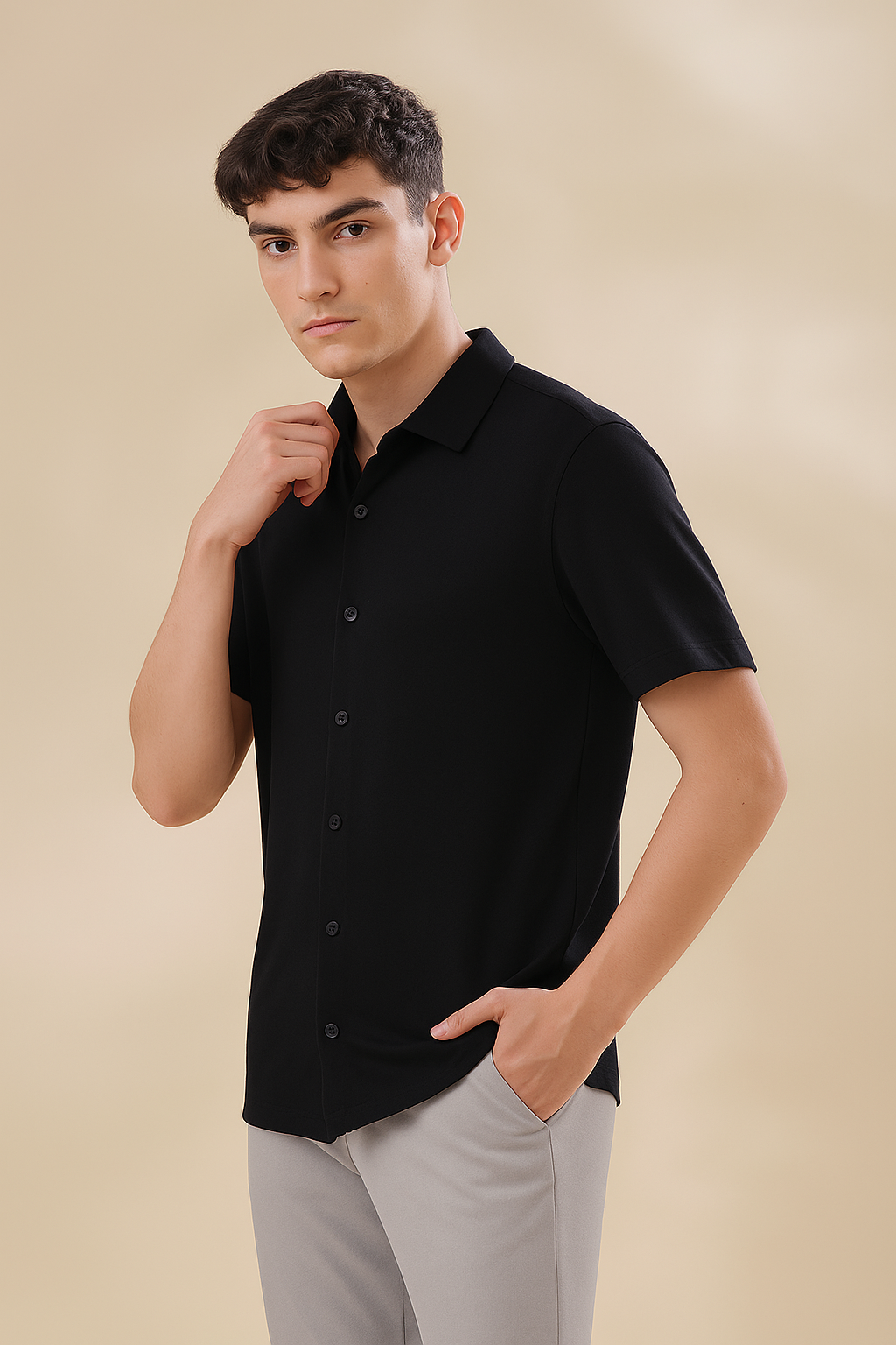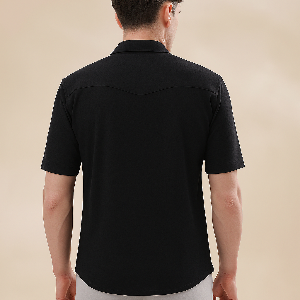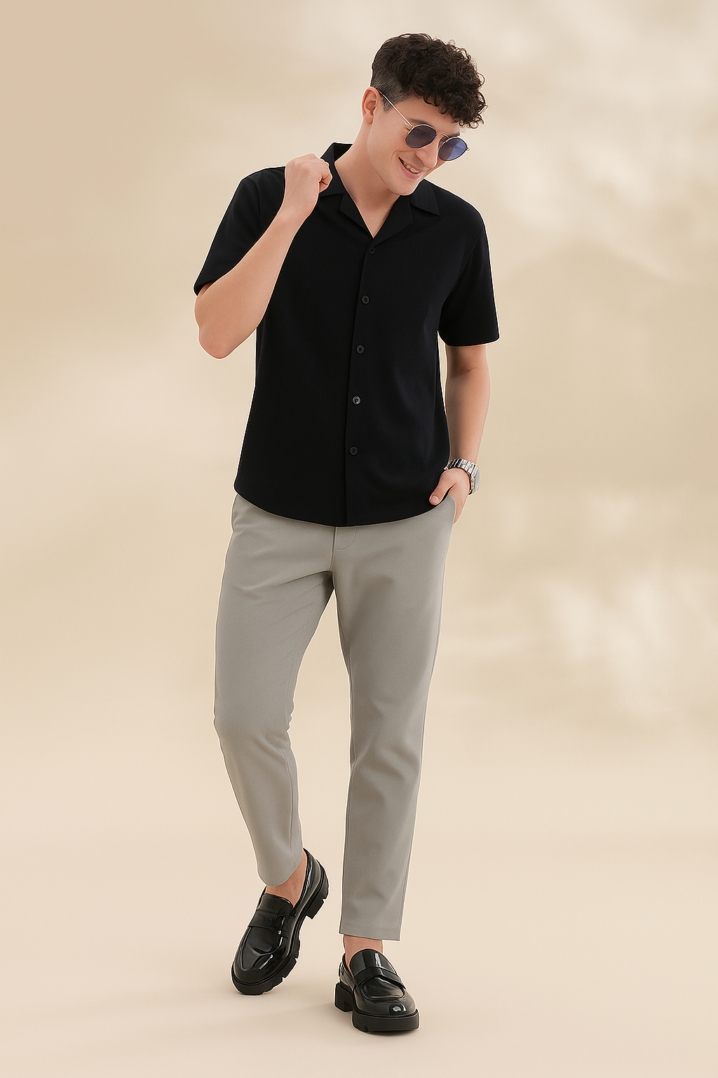 Perfect Pairing – The deep onyx shirt contrasts beautifully with the ash grey trousers, creating a balanced, versatile look.
